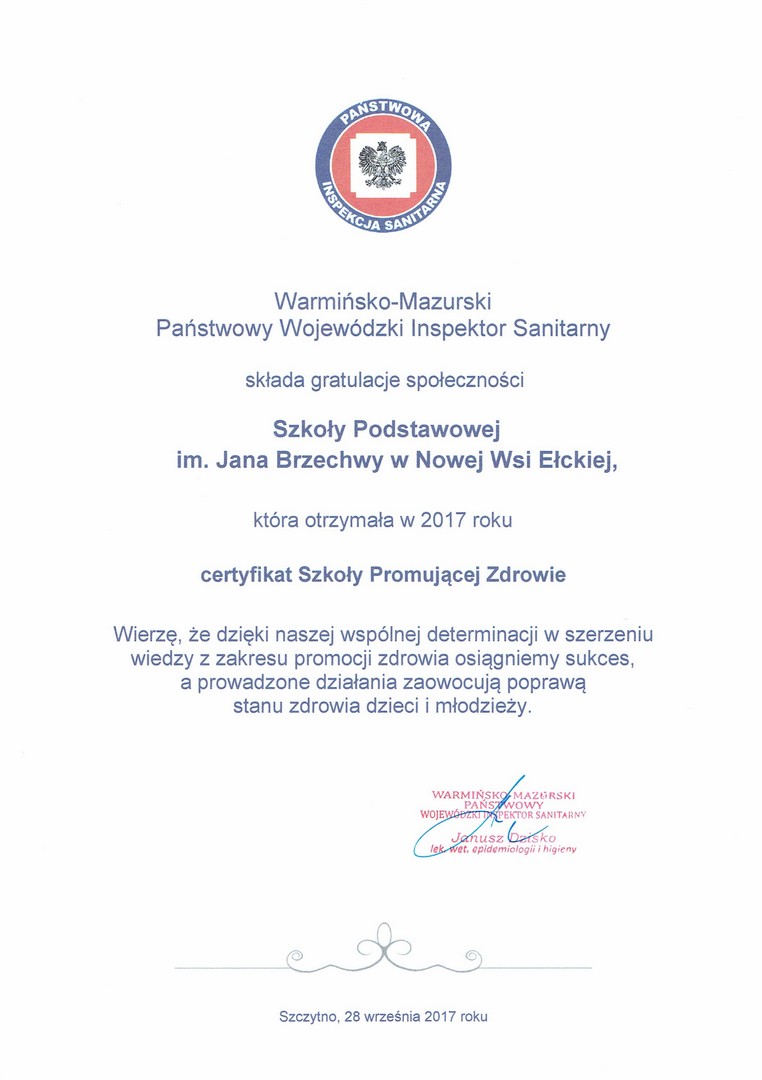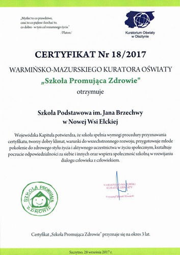 29 września 2014 r. Wojewódzka Kapituła Certyfikatu "Szkoła Promująca Zdrowie" przyznała Szkole Podstawowej im. Jana Brzechwy w Nowej Wsi Ełckiej Akt przynależności do grupy szkół ubiegających się o Certyfikat Warmińsko-Mazurskiego Kuratora Oświaty. Przyznany dokument jest gwarancją, że nasza szkoła pracuje zgodnie z modelem szkoły promującej zdrowie.