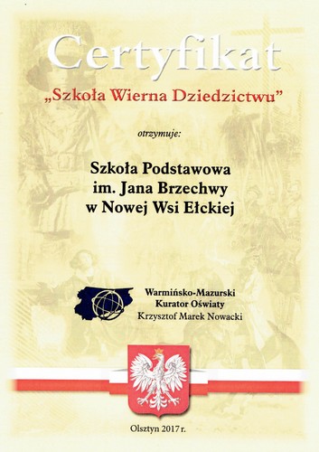 Dnia 28 września 2017 r. nasza szkoła otrzymała Certyfikat Warmińsko-Mazurskiego Kuratora Oświaty
